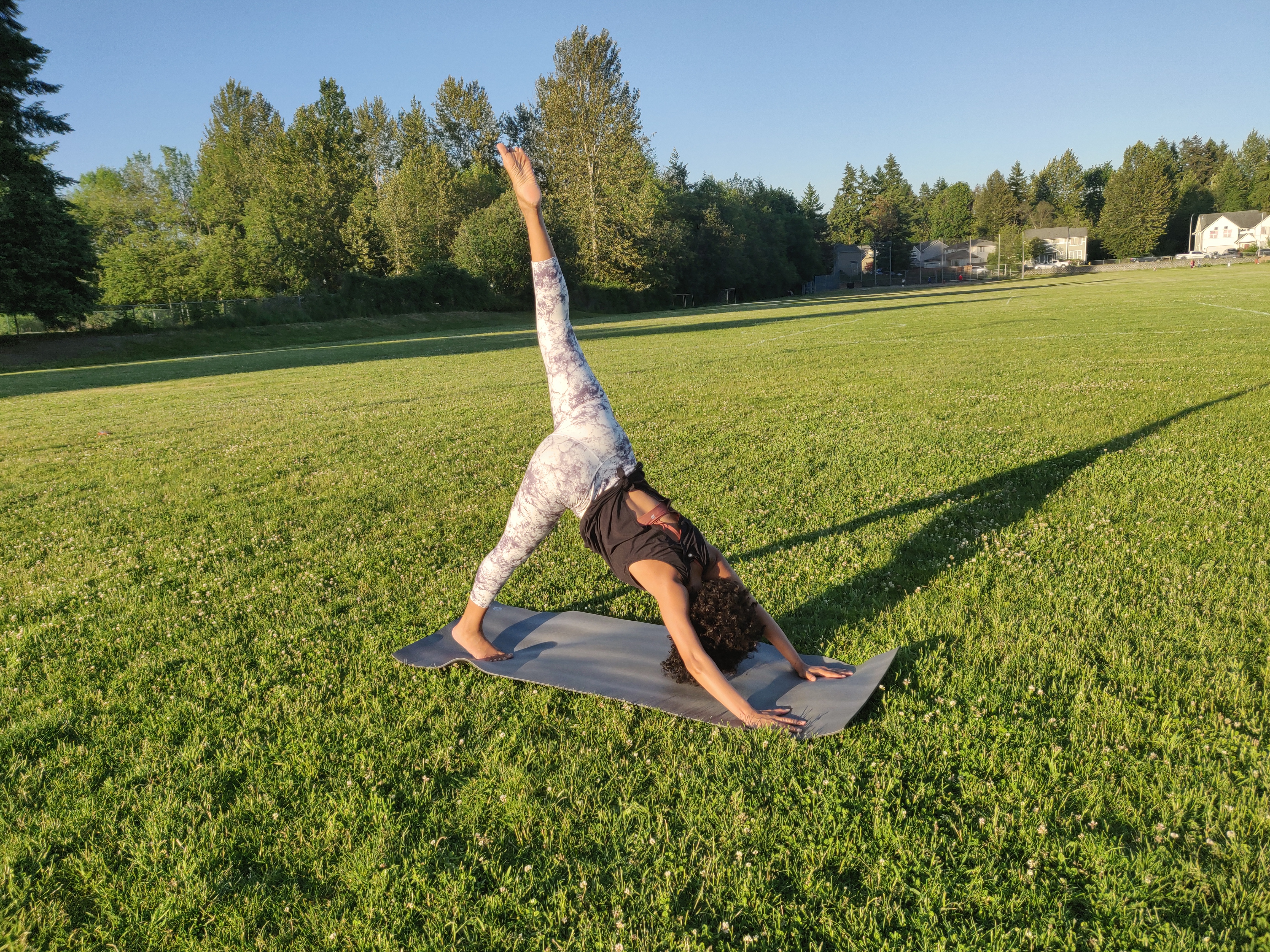 And then came yoga. I had no idea what to expect because I’d never taken a yoga class before. I unrolled my sticky mat on the lumpy ground and took off my socks and sneakers. I sat crisscross applesauce on my mat and waited for the teacher, Candice, to lead us on this journey. She had us sit with our eyes closed, inhaling and exhaling. It was relaxing. I could hear people in the park chattering, dogs barking, birds tweeting.